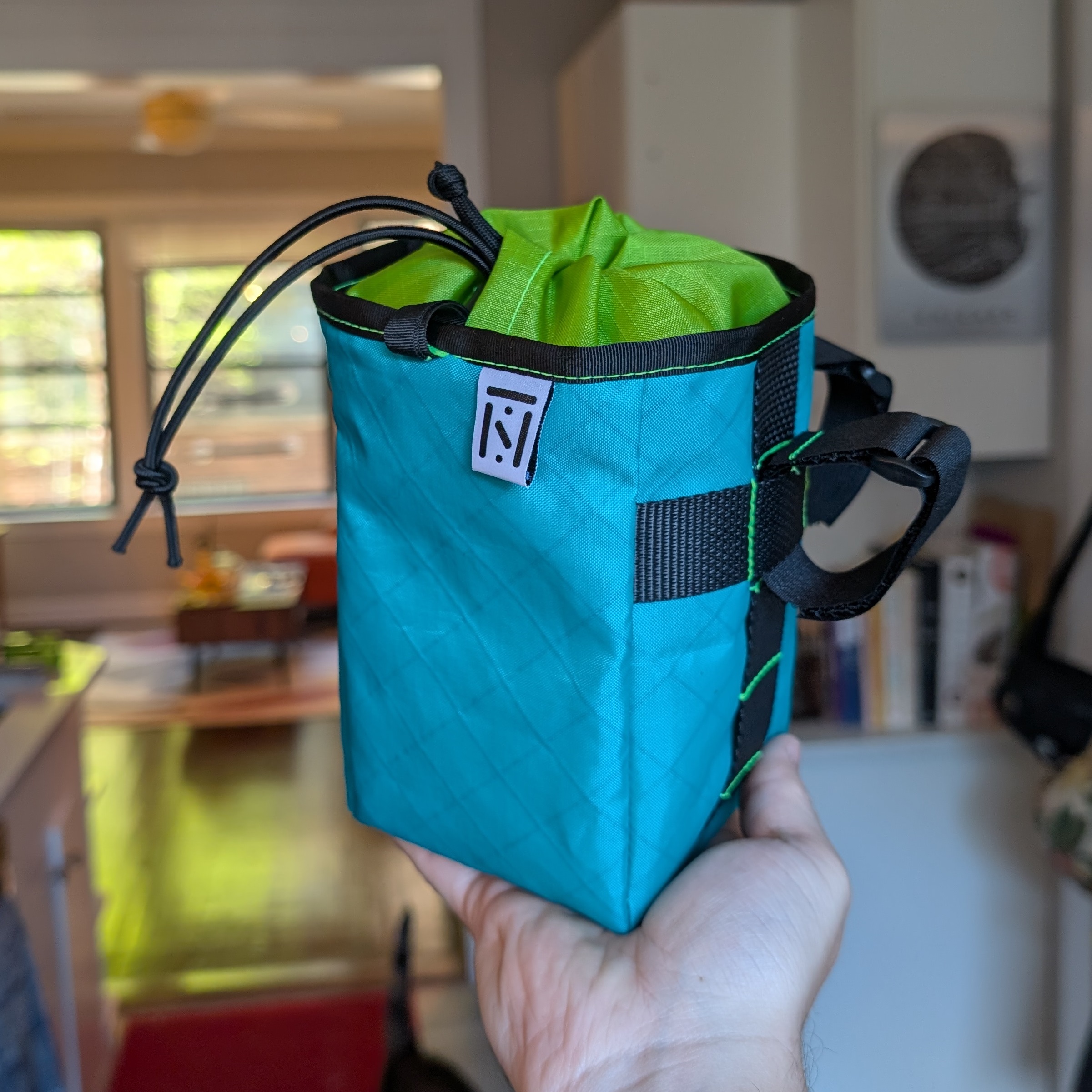 Stem Bags are simple sacks that attach to the stem and/or handlebars of a bike. This one in particular uses a Cyberian Cord Lock, a cord lock that allows for opening and closing using one hand while on your bike. They are becoming more prevalent on modern stem bag designs.